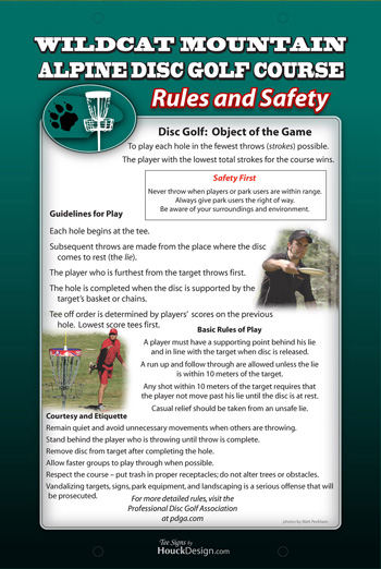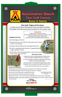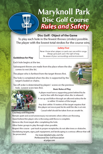 - Essential rules and courtesy of disc golf, plus your custom safety instructions
